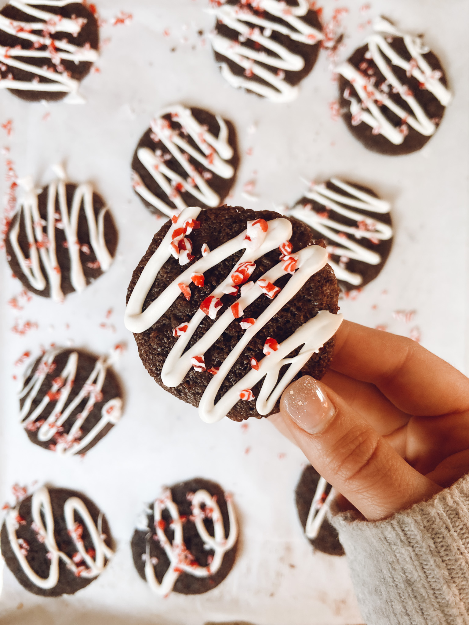 Gluten-Free Peppermint Hot Chocolate Cookies are the ultimate holiday cookie. A soft, chewy chocolate cookie embedded with mini chocolate chips, and topped with a drizzle of vanilla candy coating and crushed candy canes. A decadent take on peppermint hot chocolate, in the form of a cookie!