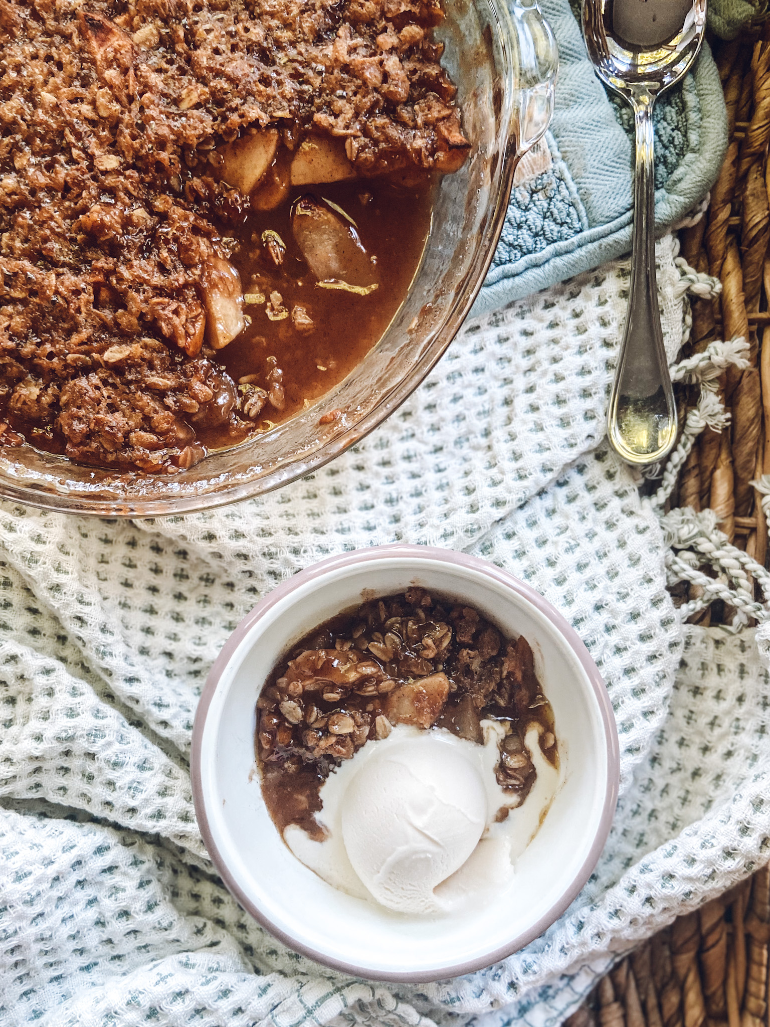 Before digging in, wait for 15 minutes or so to let the crisp settle and cool. Then, it's time to gobble it up with a scoop of vanilla ice cream!